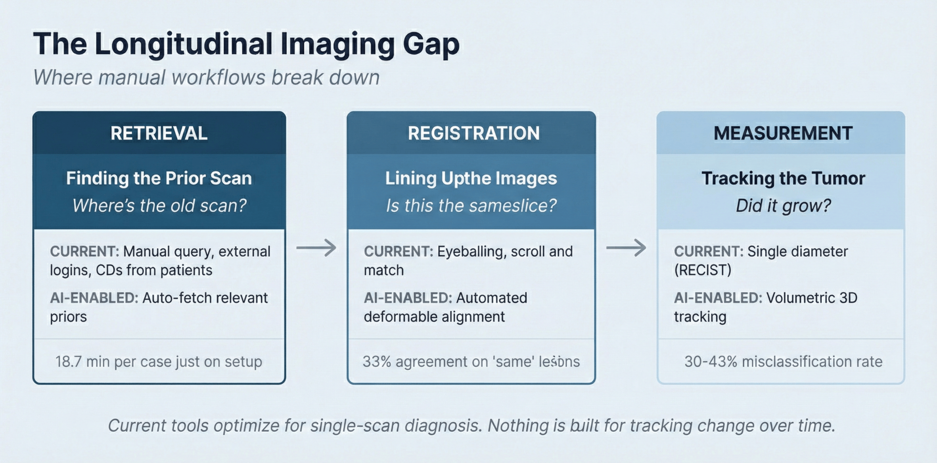 Here's the real problem. In cancer care, the important thing isn't what the scan shows today. It's how today compares to last time. The signal is in the change. And almost nothing is built to measure change.